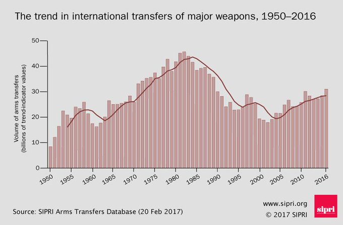 The volume of transfers of major weapons in 2012–16 was 8.4% higher than in 2007–11: bit.ly/2kBmpqs#ArmsTransfers #SIPRIFacts