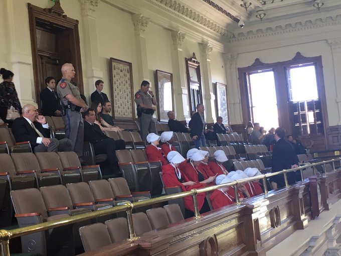 La semana pasada, un grupo de activistas vestidos con trajes inspirados en los vestidos rojos y las mujeres con capucha blanca en el libro se ven obligados a usar, se sentaron en silencio en el Senado de Texas cuando los legisladores votaron proyectos de ley que limitarían los derechos reproductivos. Los proyectos de ley pasaron. Atwood dijo que la escena de las mujeres rodeadas por los guardias de seguridad de armas de fuego era misteriosa. "Podría haber sido una parada del show", dijo.