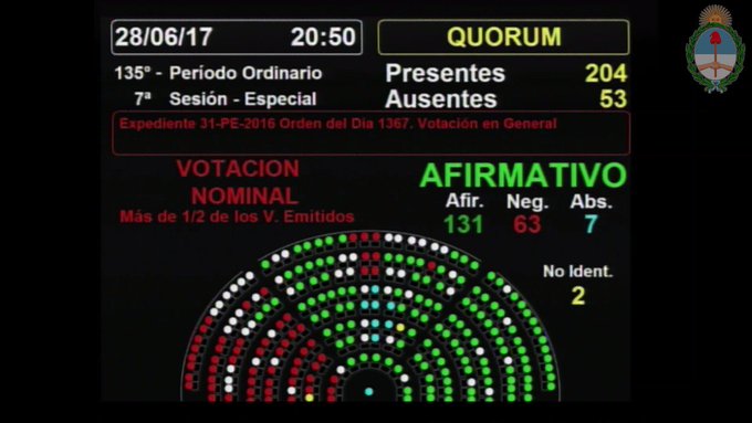 La coalición Cambiemos, logró la aprobación con el apoyo del massismo, que, a cambió, consiguió el compromiso del oficialismo para que se consideren algunas de sus propuestas durante el tratamiento en particular.