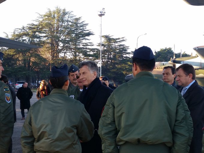 El presidente Mauricio Macri observó los detalles de remodelación del Hércules C-130, acompañado por el ministro de Defensa, Julio Martínez; el jefe del Estado Mayor de la Fuerza Aérea, brigadier general Enrique Amrein, y otras autoridades del arma.