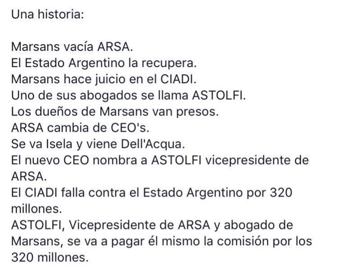 Por su parte, quien también aprovechó para meterse en el tema fue Cristina Kirchner, que no puntualizó en Astolfi sino en el abogado Alejandro Fargosi, a quien ligó al macrismo. La ex presidenta aseguró que el ex integrante del Consejo de la Magistratura trabajó junto al fondo buitre Burford Capital, que le compró el juicio a Marsans. Se trata de una práctica habitual de este tipo de fondos, que se dedican a litigar contra estados o empresas en crisis.