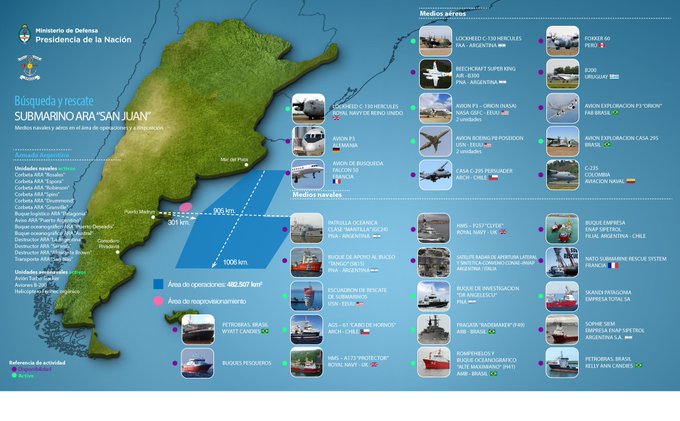 La Armada Argentina informó a través de un comunicado de prensa los distintos medios que han movilizado para realizar la búsqueda del submarino que está perdido desde el miércoles de la semana pasada con sus 44 tripulantes a bordo.