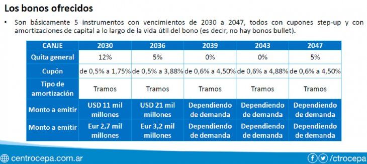 - Argentina ofrece bonos con intereses step-up (es decir, que van subiendo con el tiempo), pero comenzando de niveles 0,5%/0,6% y sin superar en ningún caso el 5% a finish. Lo que en comparación con los cupones actuales representa una fuerte quita de interés. Sin embargo, la misma es entendible en el marco de la quita de capital propuesta.