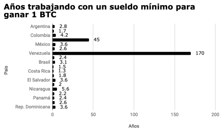 Para hacer el cálculo de cuántos años de trabajo tomamos en cuenta un valor promedio de Bitcoin al 30 de abril de USD $8.800. El valor del sueldo mínimo de cada país para el año 2020 se convirtió en dólares estadounidenses, para unificar criterios a la hora de hacer el cálculo.