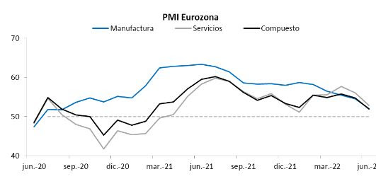 Ventas de viviendas de EE.UU. se ubicaron por encima de lo esperado Los futuros de los principales índices de acciones en Estados Unidos operaron al alza en la mañana de hoy. En la rueda de ayer, el S&P 500 cayó un 0,1%, el Dow Jones un 0,1%, y el Nasdaq un 0,1%. En lo que va del año acumulan retrocesos de 21,1%, 16,1% y 29,3%, respectivamente. Por su lado, el rendimiento del bono del Tesoro americano a 10 años se ubicó en 3,13%. En la Eurozona, el Índice de Gerentes de Compra (PMI por sus siglas en inglés) compuesto se ubicó en 51,9 puntos en junio; por debajo del registro de mayo y de la estimación realizada por el consenso de analistas de 54 puntos. De este modo, al situarse por encima de los 50 puntos, el PMI tuvo una expansión en la actividad del sector. Asimismo, el PMI manufacturero en junio para la Eurozona cayó a 52 puntos d esde el 54,6 registrado en mayo; resultado que estuvo por debajo de lo estimado de 53,9 puntos. Por otro lado, el PMI compuesto de Reino Unido se ubicó en 53,1 puntos en junio, por encima de lo esperado por el consenso de analistas de 52,6 puntos, luego de haber registrado 51,8 puntos en el mes de mayo. En Estados Unidos, Jerome Powell, el presidente de la Reserva Federal, reconoció las dificultades que puede presentar lograr un “aterrizaje suave” donde la inflación esté controlada pero sin causar una caída del crecimiento. |